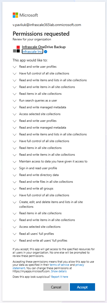 - Select a Microsoft 365 account that has the Global Administrator or OneDrive Administrator role and application impersonation permissions.