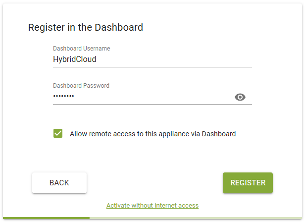 Select Allow remote access to this appliance via Dashboard if needed, and then click Register.